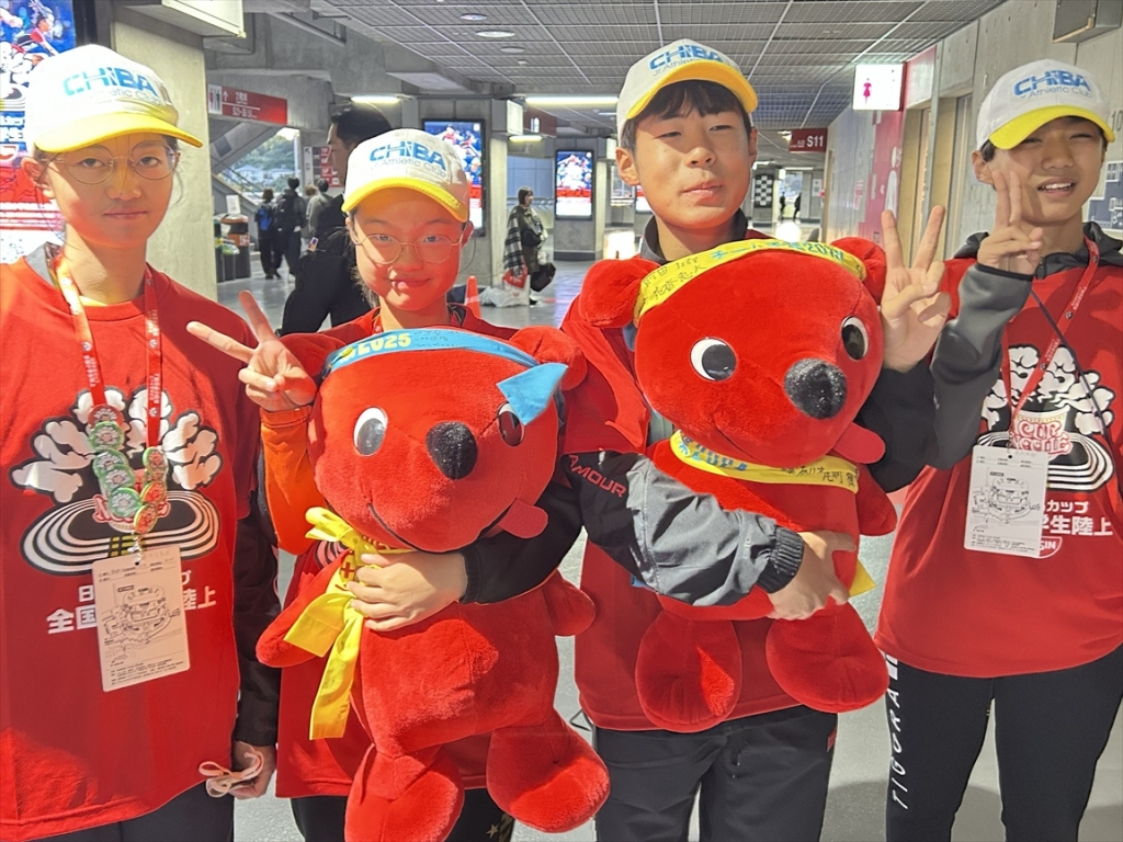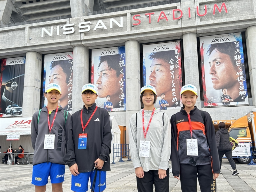 Team千葉横断幕をバックにチームメイトとポーズ!「リレ-のアップに行ってきます!」
