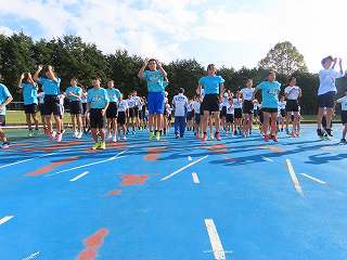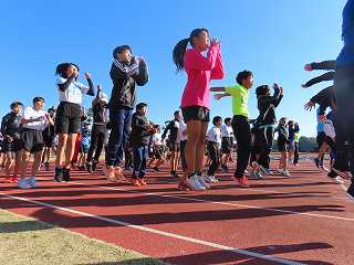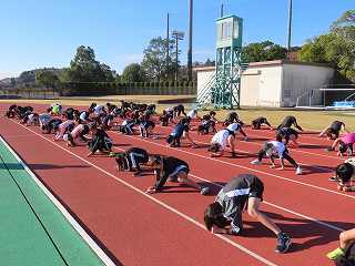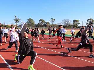 今日は清々しい冬晴れの中、全体での動的ストレッ